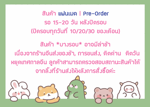 เนื่องจากเป็นสินค้า Pre-Order อาจใช้เวลารอสินค้านานหลายสัปดาห์ เพื่อป้องกัน Order ถูกยกเลิกจากระบบและผู้ซื้อระหว่างรอสินค้า