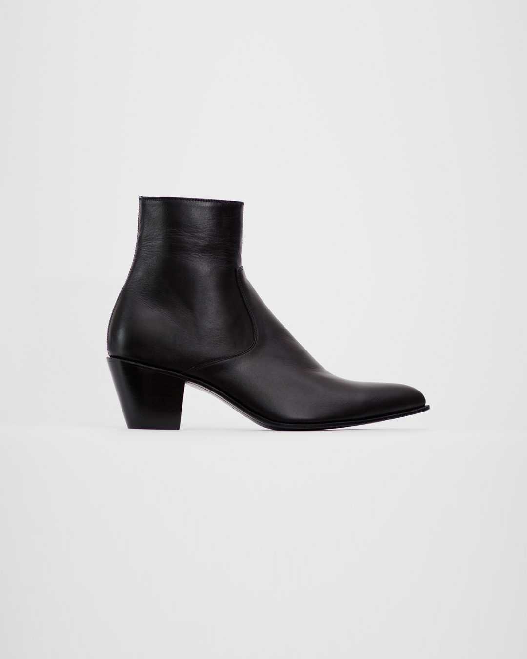 F. Costello ankle boots. Crafted from black nappa cow leather. Set on a 2.5 inches cuban heel. Each pair is unique. Crafted by hand by Rich Cast of Characters artisans. This elegant ankle boots is distinguished by its slender shape, extra- pointed toe.
