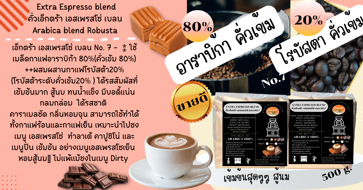 🔥เอ็กตร้า เอสเพรสโซ่ เบลน No. 7 - ⁑ ใช้เมล็ดกาแฟอาราบิก้า 80% (คั่วเข้ม 80%)ผสมผสานกาแฟโรบัสต้า20% >(โรบัสต้าระดับคั่วเข้ม20% ) ได้รสสัมผัสที่เข้มข้นมาก สู้นม ทนน้ำแข็ง มีบอดี้แน่น กลมกล่อม ได้รสชาติ