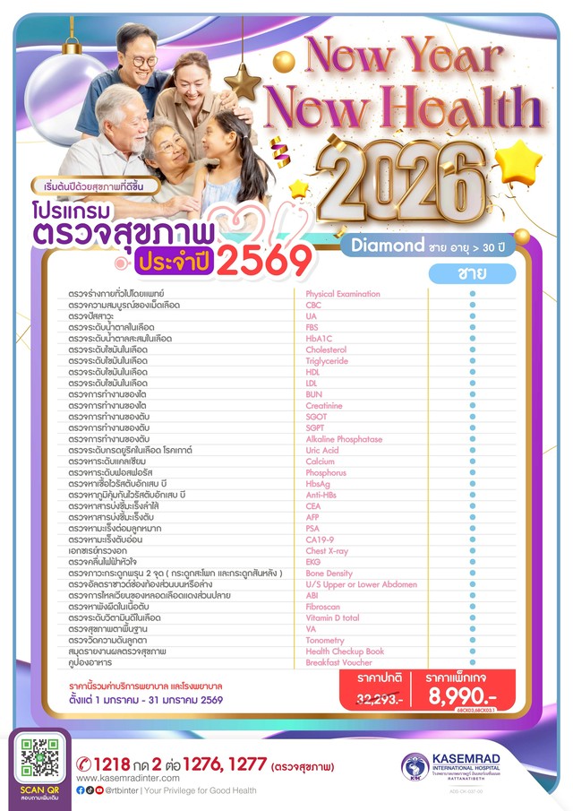 แพ็กเกจ Health Check up (โปรแกรม Diamond เพศชาย) ราคา 8,990.- บาท