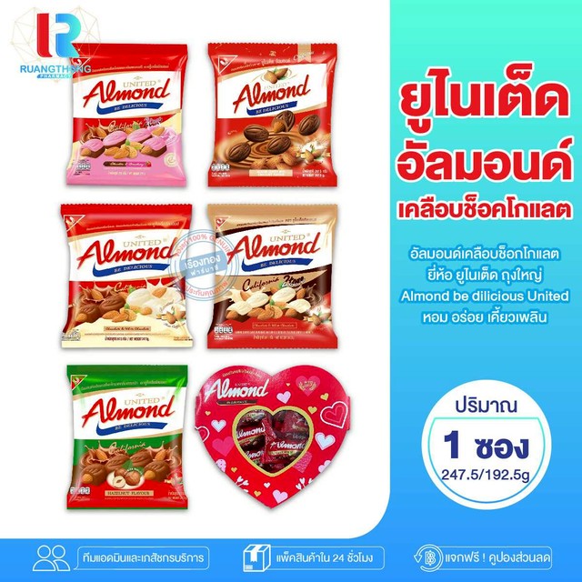 อัลมอนด์คุณภาพดี เคลือบช็อคโกแลต แน่นๆ มี 2 รสชาติ 1. ช็อคโกแลต (Chocolate) 2. ช็อคโกแลตผสมไวท์ช็อค (Chocolate & White Chocolate) 3. Two tone (2tone) ช็อคโกแล็ตและไวท์ช็อคโกแลตอยู่บนเม็ดเดียวกัน 4. Two tone Stawberry ชอคโกแลต และสตอร์เบอร์รี่อยู่บนเม็ดเดียวกัน 5. ดาร์ค ช็อคโกแลต ได้รสช็อคโกแลตแบบเต็มๆ 6. วูดดี้(Woody) ช๊อคโกแลตสอดไส้ลายไม้ มี 4 ไส้ในถุง ; ลูกเกด,อัลมอนด์, เยลลี่ และขนมปังกรอบ