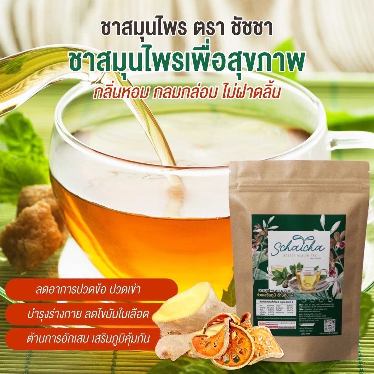 ชาสมุนไพรช่วยเสริมภูมิและต้านภูมิแพ้ ตรา ชัชชา Schatcha Better Heath Tea เป็นเครื่องดื่มที่มีส่วนประกอบจากสมุนไพรชั้นนำที่มีคุณสมบัติที่ช่วยให้ร่างกายมีสุขภาพแข็งแรงและสามารถต้านต่ออันตรายจากสิ่งแวดล้อมได้ดีขึ้น และเนื่องจากมีส่วนผสมของสมุนไพรต่างๆที่มีรสชาติอร่อย ไม่มีน้ำตาล ทำให้เป็นเครื่องดื่มที่มีรสชาติหอมหวานนุ่มละมุนเข้ากับปาก ให้ความสุขและความผ่อนคลายในทุกๆ คำดื่ม และดื่มเป็นประจำวันที่ดีต่อสุขภาพและความเป็นอยู่ของเราโดยทั่วไป ควรดื่มวันละ 2 ครั้งเพื่อเพิ่มประสิทธิภาพในการเสริมสร้างภูมิคุ้มกันร่างกายและลดอาการภูมิแพ้ให้สงบลงอย่างมีประสิทธิภาพยิ่งขึ้น โดยสามารถดื่มร้อนหรือเย็นได้ตามความชอบ รสชาติอร่อยและสุขภาพดี เหมาะสำหรับทุกเพศทุกวัย และทุกสถานการณ์ชีวิตที่ต้องการความสดชื่นและสุขภาพดีตลอดเวลา แนะนำให้บริโภคร่วมกับอาหารหรือเป็นเครื่องดื่มระหว่างมื้ออาหารเพื่อเพิ่มประสิทธิภาพในการดูแลสุขภาพร่างกายอย่างเป็นระบบอีกด้วย