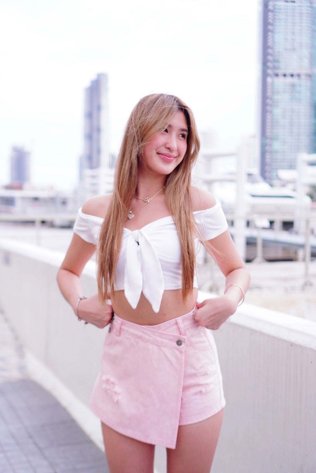 SIGNATURE DENIM CROSSED SKORT ♡ กางเกงกระโปรงผ้ายีนส์ - สีชมพูอ่อน