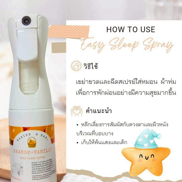 - เขย่าขวดและฉีดพ่นสเปรย์ใส่หมอน ผ้าห่ม เตียงนอน หรือภายในห้องนอนเพื่อการพักผ่อนนอนหลับอย่างมีความสุขมากขึ้น