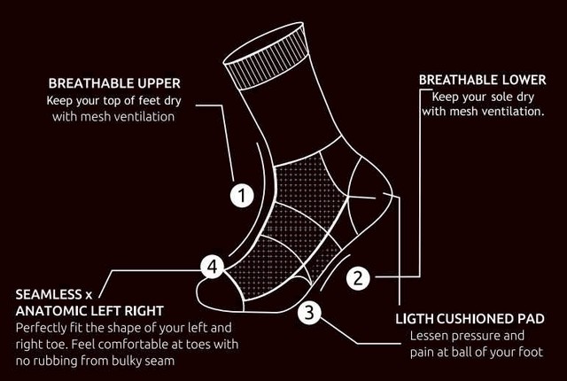 การออกแบบบริเวณปลายเท้า แบบไร้ตะเข็บ และโค้งตามปลายเท้าซ้ายและขวาของคุณ ทำให้การสวมใส่ถุงเท้าพอดีแนบเท้า แบบไม่เหลือเนื้อผ้า และมีตะเข็บให้เกิดการบาดเจ็บจากการเสียดสี