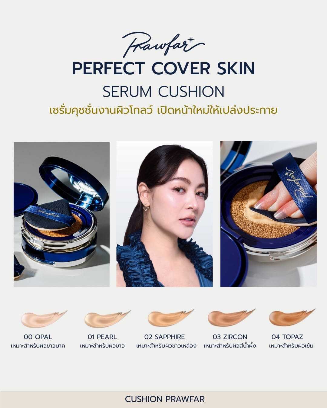 เซรั่มคุชชั่น แบรนด์ พราวฟ้า #ฉ่ำโกลว์โซจึ้ง ปกปิดผิวเรียบเนียน คุมมัน ผิวเล่นแสงแบบพี่สาวเกาหลี มีกันแดด Hybrid SPF 35 PA+++ ไม่ทำให้ผิวอุดตัน มี 5 เฉดสี เบอร์ 00 เหมาะกับผิวขาวมาก เบอร์ 01 เหมาะกับผิวขาว เบอร์ 02 เหมาะกับผิวขาวเหลือง เบอร์ 03 เหมาะกับผิวสองสี เบอร์ 04 เหมาะกับผิวเข้ม เซรั่มคุชชั่น ใส่ใจทุกสภาพผิว ใส่สารสกัดที่ช่วยบำรุงผิวหน้า มี Hya 4D เติมน้ำให้ผิว ช่วยให้ผิวยืดหยุ่น ผงไข่มุก ช่วยให้ผิวใสเล่นแสง Niacinamide ลดรอยดำรอยแดง ปลอบประโลมผิว Ceramide ฟื้นฟูผิวให้แข็งแรง Aloe ให้ความชุ่มชื้น สูตรอ่อนโยน เน้นบำรุง , ไม่มีน้ำหอม และพาราเบน