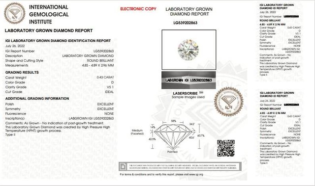 Syn diamond Round Brilliant เพชรทรงกลม ขนาด 0.43CT เพชรแท้จากห้องแลป ใบเซอร์ IGI #020