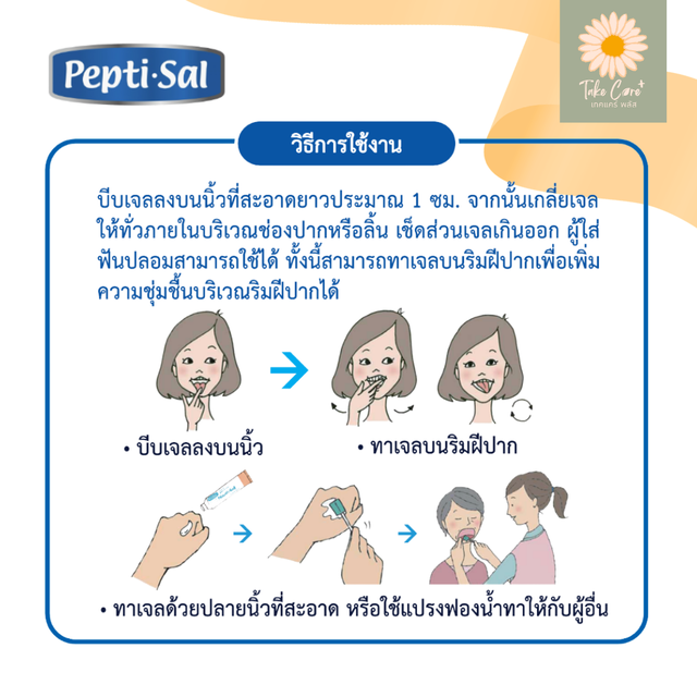 เจลใช้ทาภายในบริเวณช่องปาก สูตรอ่อนโยน ปราศจากแอลกอฮอล์และพาราเบน ค่า pH เป็นกลาง ช่วยให้ความชุ่มชื้นภายในช่องปาก บรรเทาอาการช่องปากแห้งน้ำลายน้อย เหมาะสำหรับบุคคลทั่วไปที่มีอาการช่องปากแห้งน้ำลายน้อย รวมถึงผู้ป่วยมะเร็งที่รับการรักษาด้วยวิธีเคมีบำบัด อีกทั้งช่วยทำความสะอาดและลดกลิ่นปาก ใช้ได้ในผู้ที่ใส่ฟันปลอม