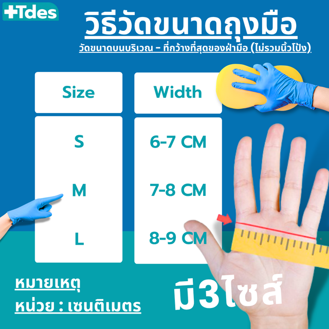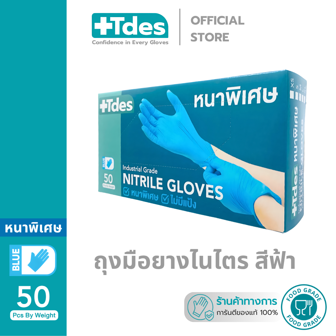 +Tdes [หนาพิเศษ] ถุงมือยางไนไตร สีฟ้า 50ชิ้น/กล่อง สัมผัสอาหาร ข้อไม่ย้วย หยิบจับไม่ลื่น