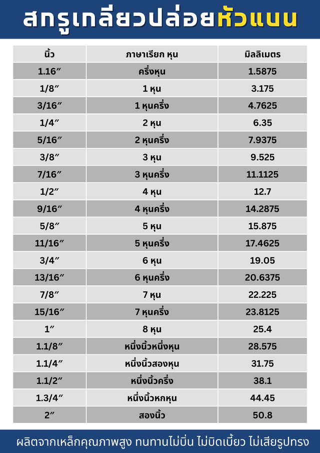 ตารางเทียบ นิ้ว/มิล/หุน