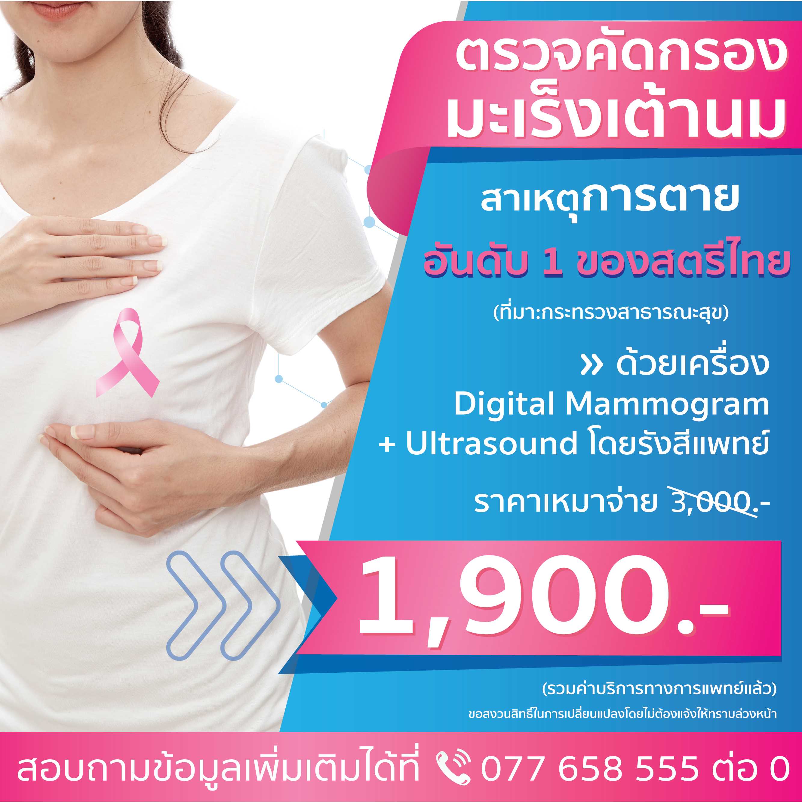 เพียงแค่วันนี้ ท่านเข้ามาพบแพทย์ เพื่่อตรวจคัดกรองมะเร็งเต้านม ( Mammogram+U/S Breast ) ด้วยเครื่องตรวจ Digital mammogram โดยแพทย์เฉพาะทางที่คอยให้คำแนะนำและดูและท่านอย่างใกล้ชิด