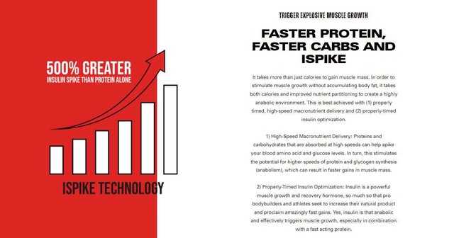 CARNIVOR MASS นั้นยอดเยี่ยม เป็นการผสมผสานระหว่างโปรตีนบีฟโปรตีนไอโซเลตที่ไฮโดรไลซ์ (BPI) ที่มีเอกลักษณ์เฉพาะเข้ากับเทคโนโลยีขยายสัญญาณอินซูลินแบบดูอัลแอ็กชันที่เรียกว่า iSpike การรวมกันของ BPI และ iSpike ทำหน้าที่ควบคู่กันเพื่อสนับสนุนแอแนบอลิซึมของกล้ามเนื้อที่ดีขึ้นในขณะที่ลดการจัดเก็บไขมัน