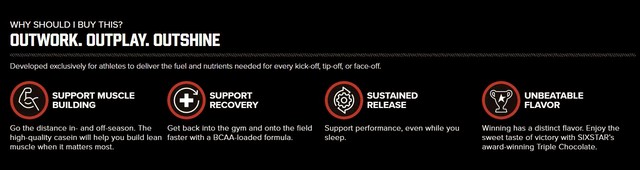 - ส่วนผสมโปรตีนที่ดูดซึมช้า – เคซีน Six Star เป็นสูตรโปรตีนผสมระดับพรีเมียมที่ให้พลังงานแก่กล้ามเนื้อของคุณเป็นเวลา 8 ชั่วโมง โดยมีคุณค่าทางชีวภาพสูงและโปรตีนที่ปลดปล่อยออกมาอย่างต่อเนื่อง ทำให้โปรตีนชนิดนี้เป็นโปรตีนที่สมบูรณ์แบบสำหรับทุกช่วงเวลาทั้งกลางวันและกลางคืน