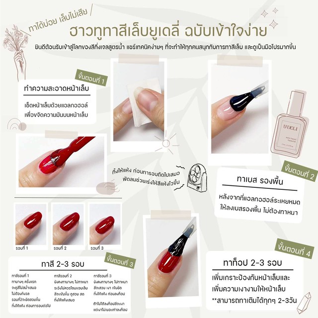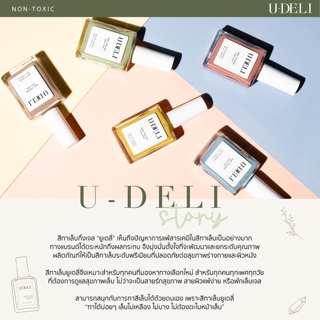 สีเล็บยูเดลี่ เป็นสีเล็บสูตรน้ำ เพราะความสะดวกสบายและความรวดเร็วในการทำสีเล็บและสามารถเปลี่ยนสีได้ทุกเมื่อสำหรับแมทช์ชุดและเอาท์ฟิตในทุกๆวัน เราออกแบบสินค้าที่เน้นความปลอดภัยต่อผู้ใช้งาน เด็ก คนท้อง และสาวๆที่ชอบทาสีเล็บแต่ไม่ต้องให้ให้เล็บเสีย เล็บบาง