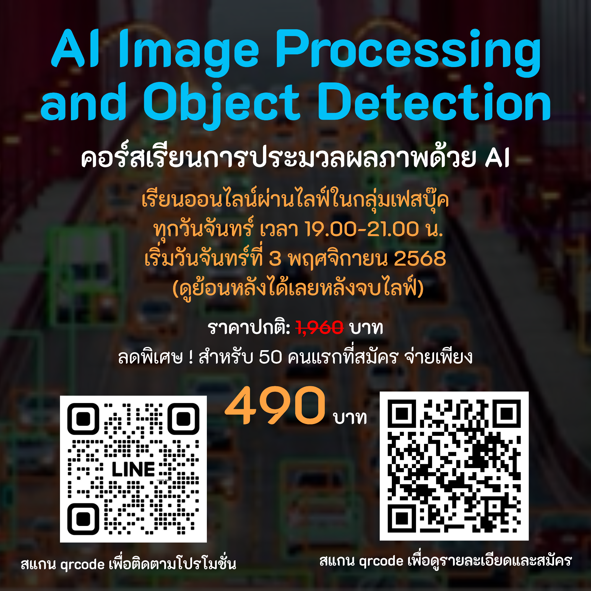 หลักสูตรนี้ออกแบบมาเพื่อปูพื้นฐานและต่อยอดความเข้าใจเกี่ยวกับการประมวลผลภาพด้วย AI ตั้งแต่การเตรียมข้อมูลภาพ การใช้โมเดลสำเร็จรูป ไปจนถึงการสร้างแอปพลิเคชันตรวจจับวัตถุและประยุกต์ใช้ในชีวิตจริง เหมาะสำหรับผู้ที่ต้องการเริ่มต้นในสาย Computer Vision และ Machine Learning โดยไม่จำเป็นต้องมีพื้นฐานลึกทางคณิตศาสตร์หรือโปรแกรมมิ่งมาก่อน