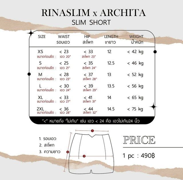 ความยาวกางเกง S = 12.5 นิ้ว / M = 13 นิ้ว / L = 13.5 นิ้ว / XL = 14 นิ้ว / XL = 14.5 นิ้ว