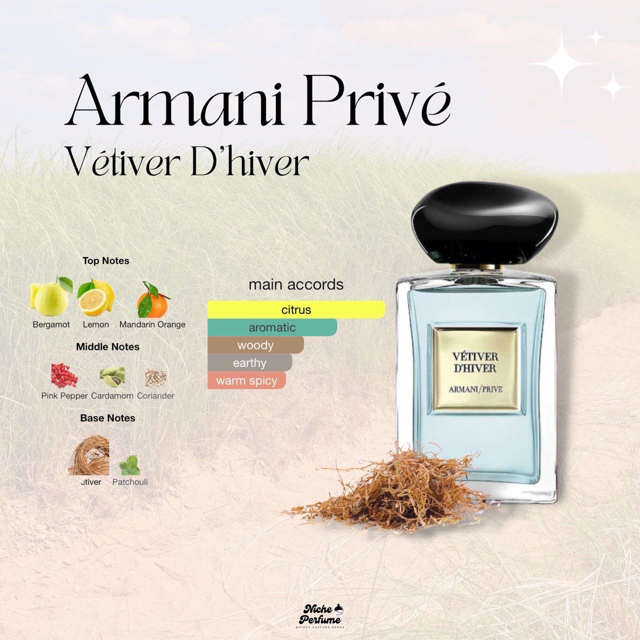 - มีกลิ่นของเครื่องเทศเบาๆของ pink pepper จบด้วยกลิ่น woody ของหญ้าแฝก