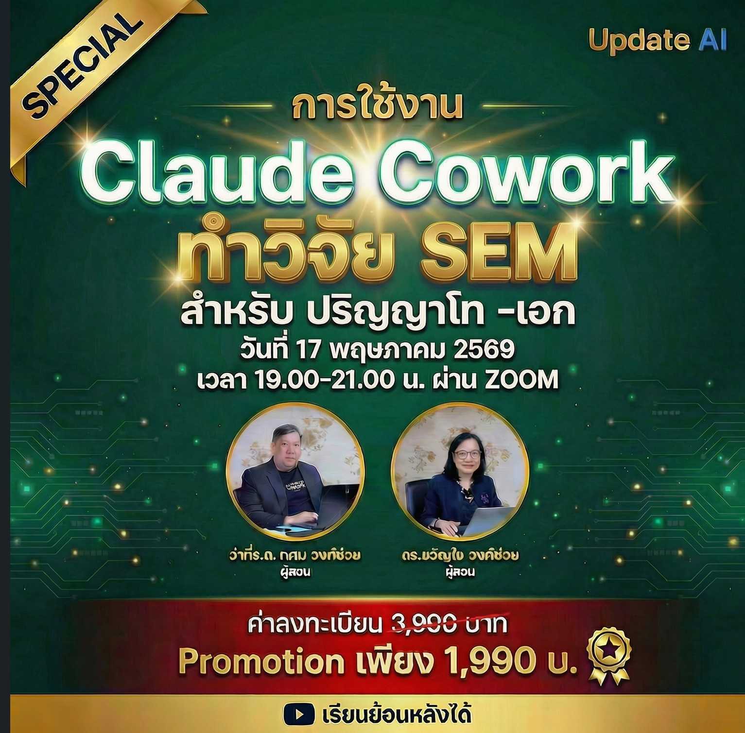 ขอแนะนำหลักสูตร "การใช้งาน Claude Cowork ทำวิจัย SEM" ที่ออกแบบมาเพื่อนักศึกษาปริญญาโทและปริญญาเอกโดยเฉพาะ หลักสูตรนี้จะมุ่งเน้นการนำเทคโนโลยีปัญญาประดิษฐ์อย่าง Claude มาร่วมประยุกต์ใช้ในการทำวิจัย เพื่อช่วยให้การจัดระเบียบข้อมูล การวิเคราะห์โครงสร้าง และการเขียนรายงานการวิจัยมีความรวดเร็วและแม่นยำมากยิ่งขึ้น โดยยังคงไว้ซึ่งมาตรฐานทางวิชาการที่ถูกต้อง