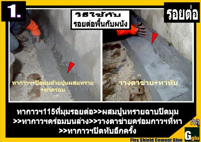 - การแก้ไขรอยแตกร้าว แนะนำใช้คู่กับตาข่ายเสริมกำลัง โดยการเซาะรอยแตกเป็นร่องตัว วี แล้วใช้กาวหยอดให้เต็มร่องแล้วทากาวปิดทับคร่อมรอยแตกพร้อมวางตาข่ายเสริมกำลัง รอกาวแห้ง แล้วทากาวทับตาข่ายอีกรอบให้สนิท