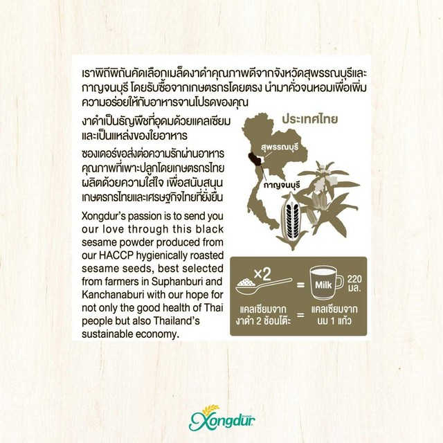 **หมายเหตุ : เป็นการเปรียบเทียบปริมาณแคลเซียมที่พบในนมวัว 220ml. กับงาดำบด 2 ช้อนโต๊ะ 15 กรัม