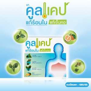 คูลแคป ผลิตภัณฑ์ยาสมุนไพร จากตำรับยาแผนโบราณไทย แก้ร้อนใน แก้เจ็บคอ บรรเทาไข้ และปรับสมดุลในร่างกาย โดยการนำสมุนไพรไทยหลายชนิด ประกอบด้วยส่วนประกอบหลักเช่น บอระเพ็ด โกฐน้ำเต้า ผักกาดน้ำ ส้มซ่า และอื่นๆ ผ่านกระบวนการผลิตที่ได้รับการรับรองมาตรฐาน ระดับ GMP Asian ทำมั่นใจในทุกขั้นตอนการผลิต