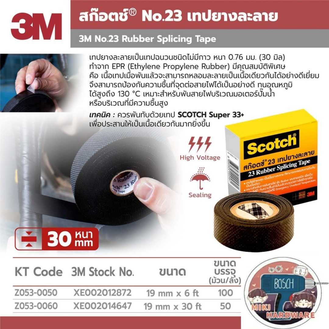 Scotch® No.23 Rubber Splicing Tape สก๊อตช์® เบอร์23 เทปพันไฟฟ้าแรงสูง เทปพันละลาย เทปยางละลาย เป็นเทปฉนวนชนิดไม่มีกาว ทำจาก EPR (Ethylene Rubber) มีคุณสมบัติพิเศษ คือเนื้อเทปเมื่อพันแล้วจะสามารถหลอมประสานตัวเองเป็นเนื้อเดียวกันได้ดีเยี่ยม จึงสามารถป้องกันความชื้นในบริเวณจุดต่อสายได้ดี ทนอุณหภูมิได้ถึง 130 องศา เหมาะสำหรับพันสายไฟภายในปั๊มน้ำ มอเตอร์ พันเพื่อเป็นฉนวนของสายเคเบิ้ลทุกประเภท งานบัสบาร์ และงานที่ต้องการความปลอดภัยสูง ควรพันทับด้วย Scotch® Super 33+™ เพื่อให้เทป Scotch® No.23 ประสานเป็นเนื้อเดียวกันได้ดียิ่งขึ้น