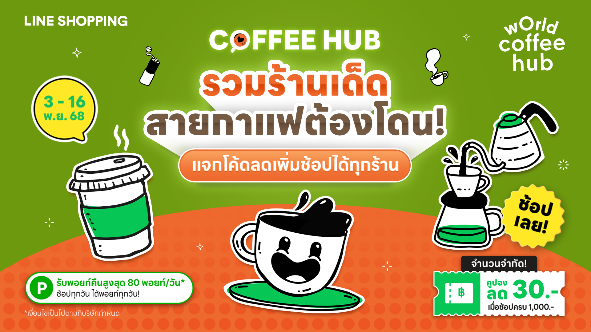 3. เมื่อผู้เข้าร่วมกิจกรรมได้จัดทำคำสั่งซื้อสินค้าสำเร็จจากร้านค้าที่เข้าร่วมกิจกรรมครั้งนี้ โดยมีมูลค่าต่อออเดอร์ หลังจากหักส่วนลดต่างๆ แล้ว และไม่รวมค่าขนส่ง ครบตามจำนวนที่กำหนด ผู้เข้าร่วมกิจกรรมจะมีสิทธิ์ได้รับคูปองส่วนลดสนับสนุน ตามเงื่อนไขดังต่อไปนี้ 3.1 กิจกรรมระหว่างวันที่ 3 พฤศจิกายน พ.ศ. 2568 ถึงวันที่ 16 พฤศจิกายน พ.ศ. 2568 (1) ผู้เข้าร่วมกิจกรรมจะมีสิทธิ์ได้รับคูปองส่วนลดมูลค่า 30 บาท ภายใต้เงื่อนไขของการซื้อสินค้าขั้นต่ำ 1,000 บาทขึ้นไป ตลอดระยะเวลากิจกรรม (2) ผู้เข้าร่วมกิจกรรมต้องทำการสั่งซื้อสินค้ากับร้านค้าบน LINE SHOPPING ที่เข้าร่วมกิจกรรมตามลิงก์นี้ [https://shop.line.me/event/coffeehub] (3) ผู้เข้าร่วมกิจกรรมไม่สามารถใช้คูปองส่วนลดดังกล่าว สำหรับสินค้าบางประเภทได้ (Prohibited Product) เช่น สินค้าควบคุมตามกฎหมาย หรือสินค้าที่มีความเสี่ยงสูงตามที่บริษัทเห็นสมควร